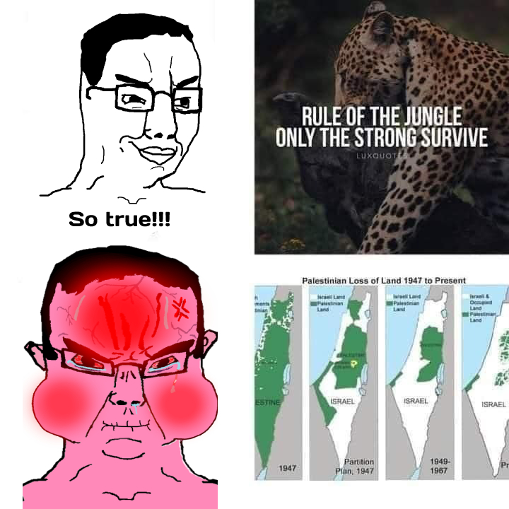 >>525933822The difference of course is that parasites do not create or thrive through merit.>>525934132The difference of course is that parasites uses the materiel and economics of foreign bodies to wage their war.I'm all for letting israel conquer its way to success.AFTER we repossess all the weapons and funding we've given it for 8 decades, and fully blockade all attempts to externally support israel.If they win fair and square, then it's theirs.Of course if other Arabs decide to conquer them in kind, that's also their problem too.