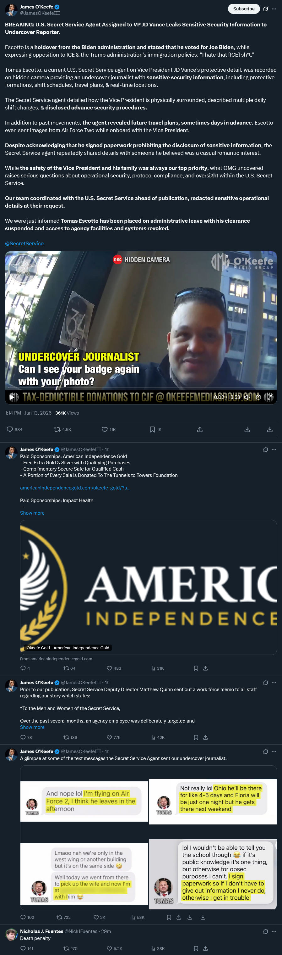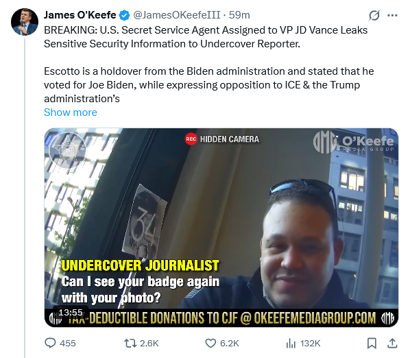 >BREAKING: U.S. Secret Service Agent Assigned to VP JD Vance Leaks Sensitive Security Information to Undercover Reporter.>Escotto is a holdover from the Biden administration and stated that he voted for Joe Biden, while expressing opposition to ICE & the Trump administration’s immigration policies. “I hate that [ICE] sh*t.”>Tomas Escotto, a current U.S. Secret Service agent on Vice President JD Vance’s protective detail, was recorded on hidden camera providing an undercover journalist with sensitive security information, including protective formations, shift schedules, travel plans, & real-time locations.https://x.com/JamesOKeefeIII/status/2011154810641203660