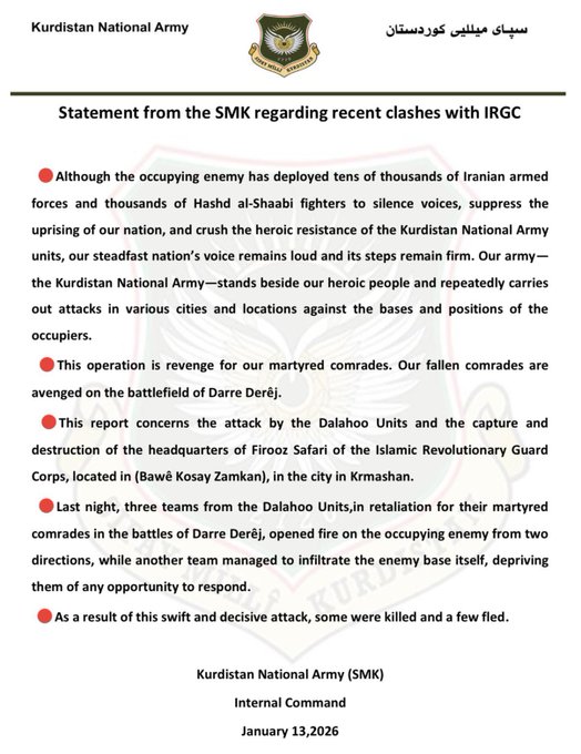 KURDS HAVE CAPTURED AN IRGC BASE IN KERMANSHAHor so they claimhttps://x.com/sentdefender/status/2011172032268972351