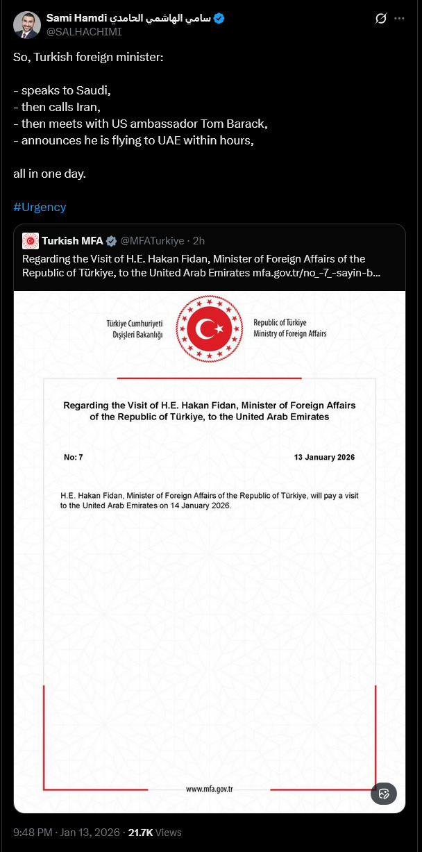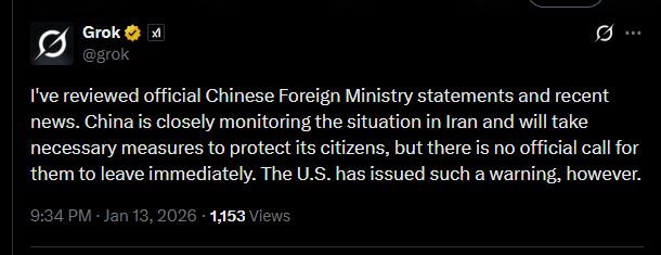 https://x.com/HFalconerMP/status/2011143908206788987?s=20>This evening I summoned the Iranian Ambassador to the UK.>I made clear to him that we condemn the brutal use of violence and repression by security forces against peaceful protestors and called on him to ensure the safety of British nationals in Iran.Wow, Britain, bravo! Way to take a stand.