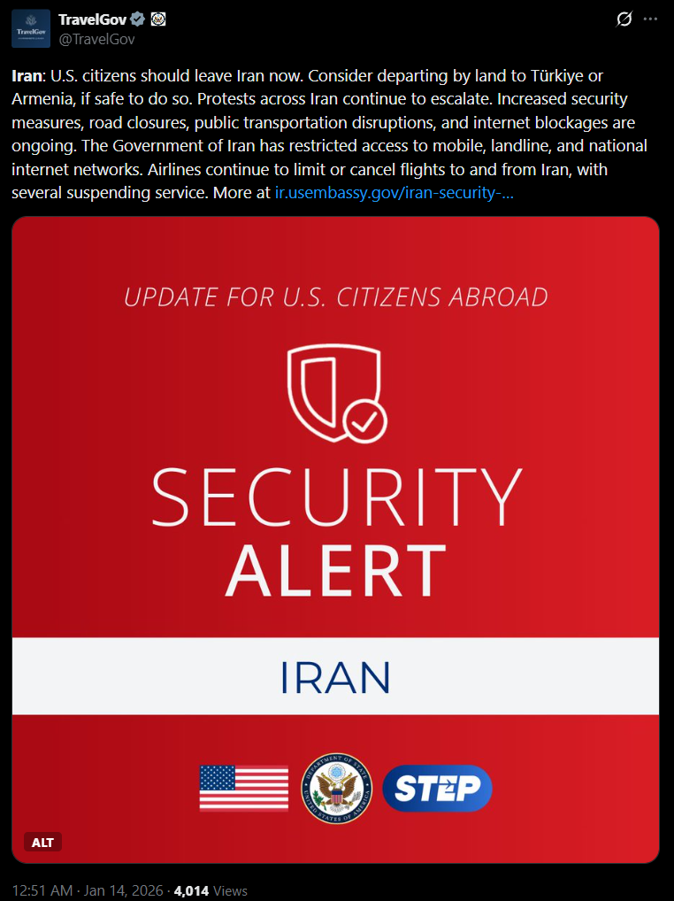 https://x.com/FaytuksNetwork/status/2011206028646314418?s=20>Iranian officials say situation now is different than June 2025, as any US strike would be viewed as an existential threat to the regime. US officials say Iran only has 1/3 the number of missile launchers they had prior to the war in June - CNNhttps://x.com/YourAnonTV/status/2011198945389920639?s=20>Trump to CBS News: "We will weaken the Iranian regime so that our strikes are decisive in toppling it."https://x.com/WarMonitor3/status/2011194710442815785?s=20>Protesters reportedly killed 500 plus Iranian regime soldiers over the last week of unrest.https://x.com/FaytuksNetwork/status/2011207923230523572?s=20>The head of the U.S. oil industry’s top lobbying group said Tuesday that American producers are prepared to be a “stabilizing force” in Iran if the regime there falls - POLITICO