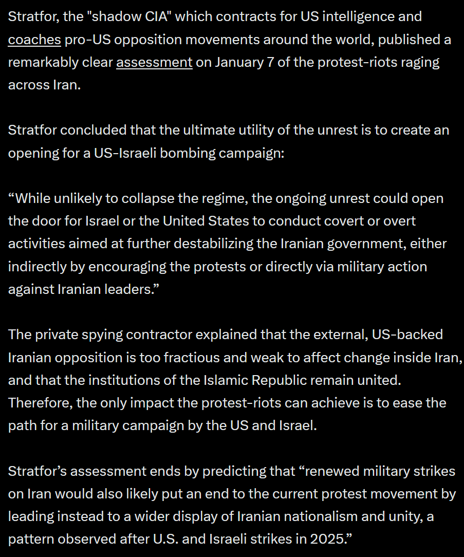 >Regime Change Riots In Iran Fail Faster Than Expected>The Iranian government did not bother to track down single terminals but used the new Russian and Chinese equipment to shut down all Starlink traffic in Iran. Packet loss rates of 90% have made the connections unusable.>Today pro-government marches are held in all major cities of Iran. >They are much bigger than anything the opposition could ever assemble. The Iranian system has again demonstrated that it is astonishingly stable. Not one official has changed side.>The riots are, for now, over. The streets tonight will likely be quiet. >During the next weeks the riot leaders and instigators will be tracked down and punished – harshly one hopes in sight of the casualties on the government side.>The total blocking of Internet traffic and international phone communication in Iran was the decisive step taken to end the riots.>Without Internet access the CIA/Mossad agents directing the rioters were unable to command and control their on-the-ground forces. The lack of ‘horror’ propaganda videos from Iran, submitted via the Internet and used by the media to rake up support for western intervention, is also important. Color-revolutions à la CIA require these tools.>In 2022 the wave of U.S. induced protests in Iran took nearly three month before it subsided. This wave, started on December 28 by a massive short-selling attack on Iran’s currency, took just two weeks before it died down.>Trump, who had threatened to bomb Iran in support of the rioters, will have to pull back. The U.S. military says that it is not ready (archived) for the revenge Iran would unleash on it.>The failing of this regime change attempt shows that the methods used in it have become too obvious and can be countered. It will likely take a while before new methods are developed and new attempts will be launched.https://www.moonofalabama.org/2026/01/regime-change-riots-in-iran-fail-faster-than-expected.html/sage/thread