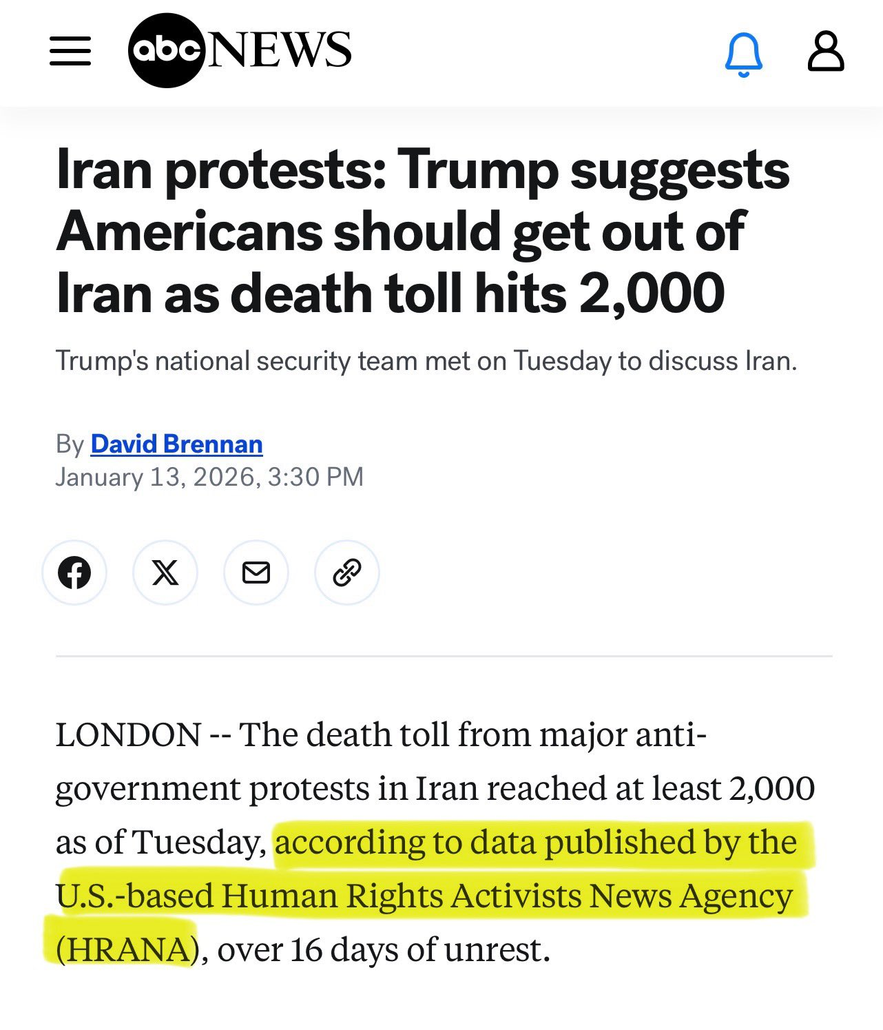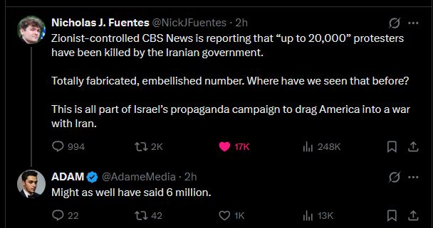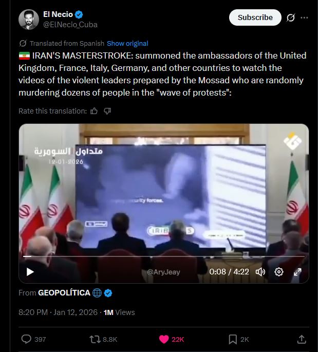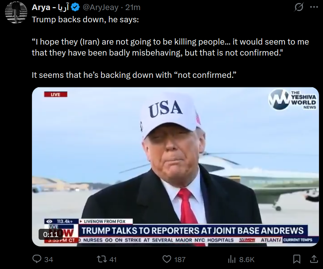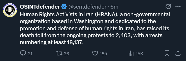 https://x.com/Faytuks/status/2011151217570033975?s=20>Executive editor of Iran International says:>"Iran International’s report of 12,000 Iranians killed by the IRGC and Basij forces is not an estimate, but is based on a report that the IRGC Intelligence Organization specifically submitted to the Presidential Office and Supreme National Security Council"https://x.com/Reuters/status/2011178969068867887?s=20>Iran's leadership is in its 'final days and weeks', Germany's Merz says