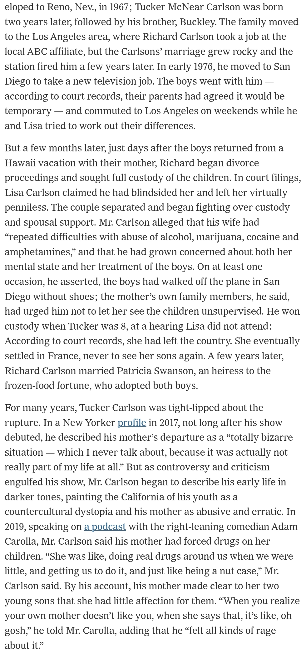 >>525935619>>525938763I more or less already heard all of this already without doing much research. Pretty sure I read on Tucker's own Wikipedia page that his mom ditched the kids to fuck around in Europe. But the way he speaks of her makes her sounds unhinged and not just neglectful. I haven't found any information that confirms that supposedly unhinged behavior.