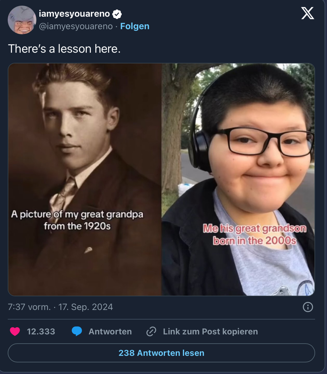 >>525943842Tbf to that kid the great grandpa clearly had fag face structure. He would look orders of magnitudes less appealing in a modern candid