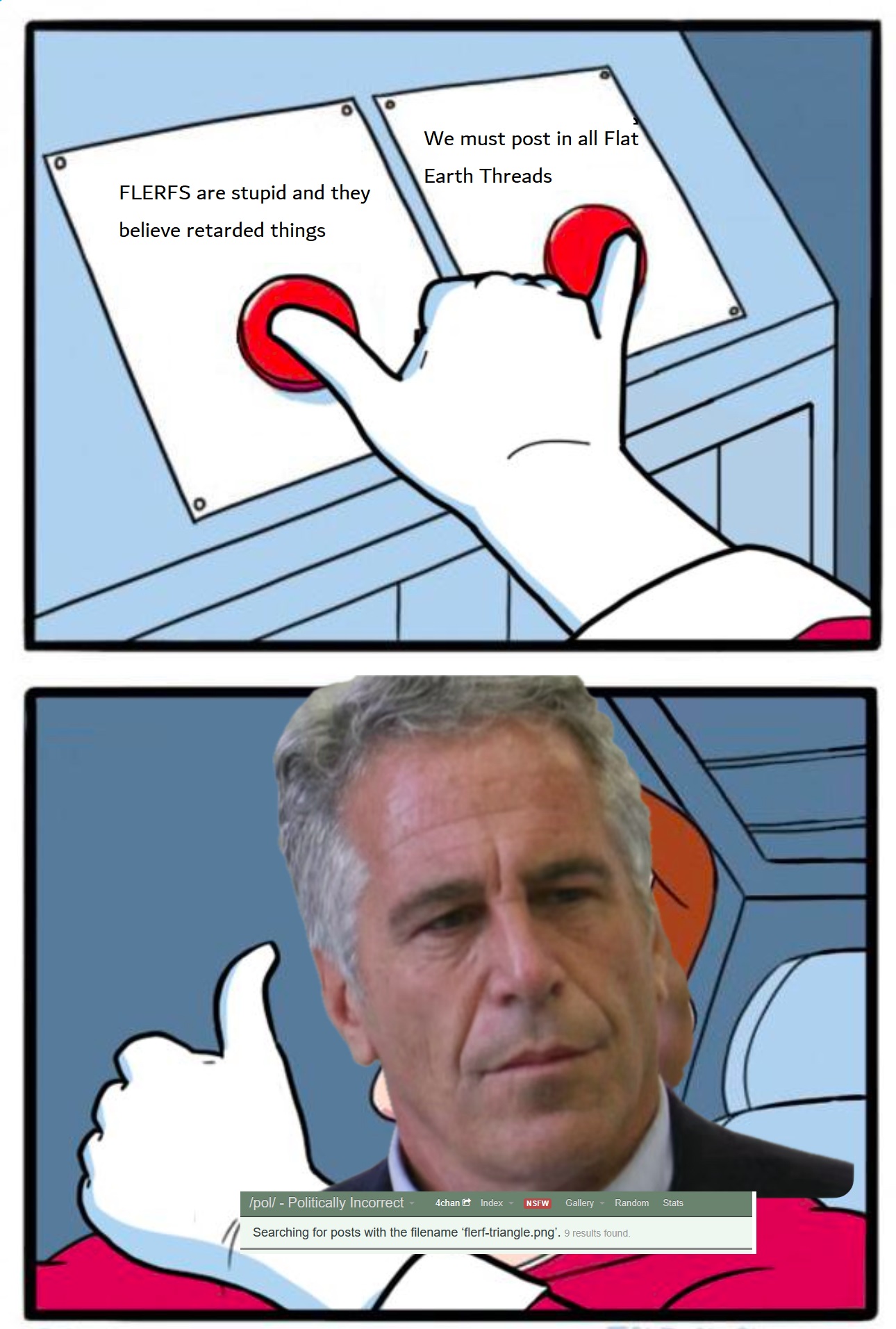 the flat earthers are paid shills and their purpose is well poisoning. to manipulate people into associating reasonable things like skepticism towards specific vaccines, as being adjacent to flat earthism.think about it, for over a year they were posting threads every hour, 24 hours, with the exact same talking points, memes, and vibes, like they were all reading off the same script. that's shills, that's astroturfing.
