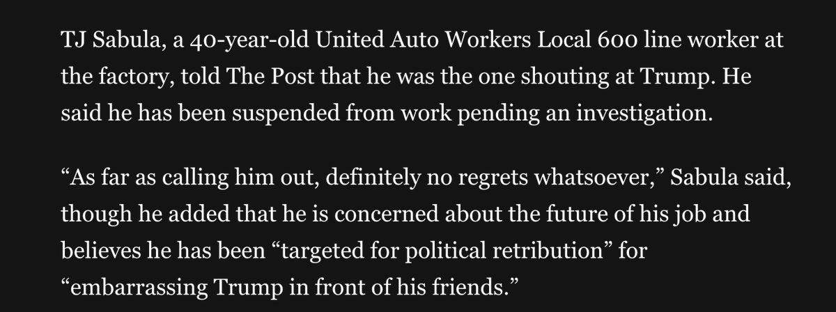>>525952941>HECKLER WAS FIRED>article (that you posted here OP, and absolutely does not take much if any time to read) literally says "the worker... has been suspended">HECKLER WAS FIREDWhy do you do this?You can't possible actually believe what your wrote down here and then clicked 'post' for, right?This goes beyond "I was only pretending to be retarded to troll" territory, so one has to assume that you are literally doing this for power projection and to shill for MIGA.