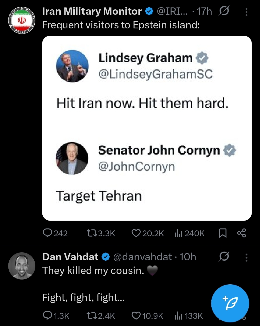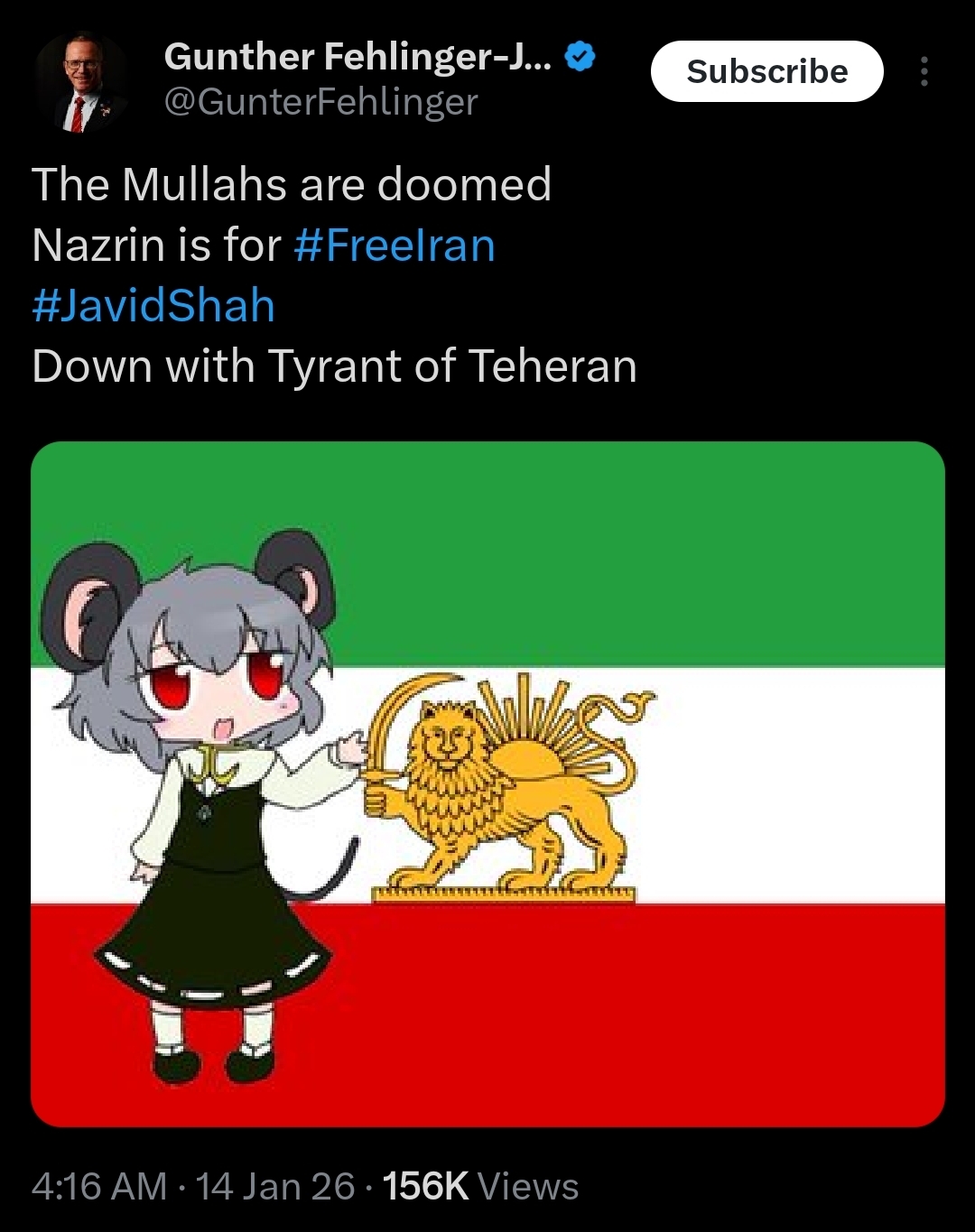 The bot spam to pump up support for toppling Iran it's the weirdest thing ever.> wild claims of gorillion dead protesters, with the number going up and down of 10k each time.> supposedly every (totally real) iranian expat on social media has an "uncle" killed in the protest (never any other kind of relative, always an uncle)> the whole "we must liberate le women" because look at how pretty they are, don't you want to have the remote off chance that she'll bounce on your cock in gratitude goy?> the fucking wannabe king...