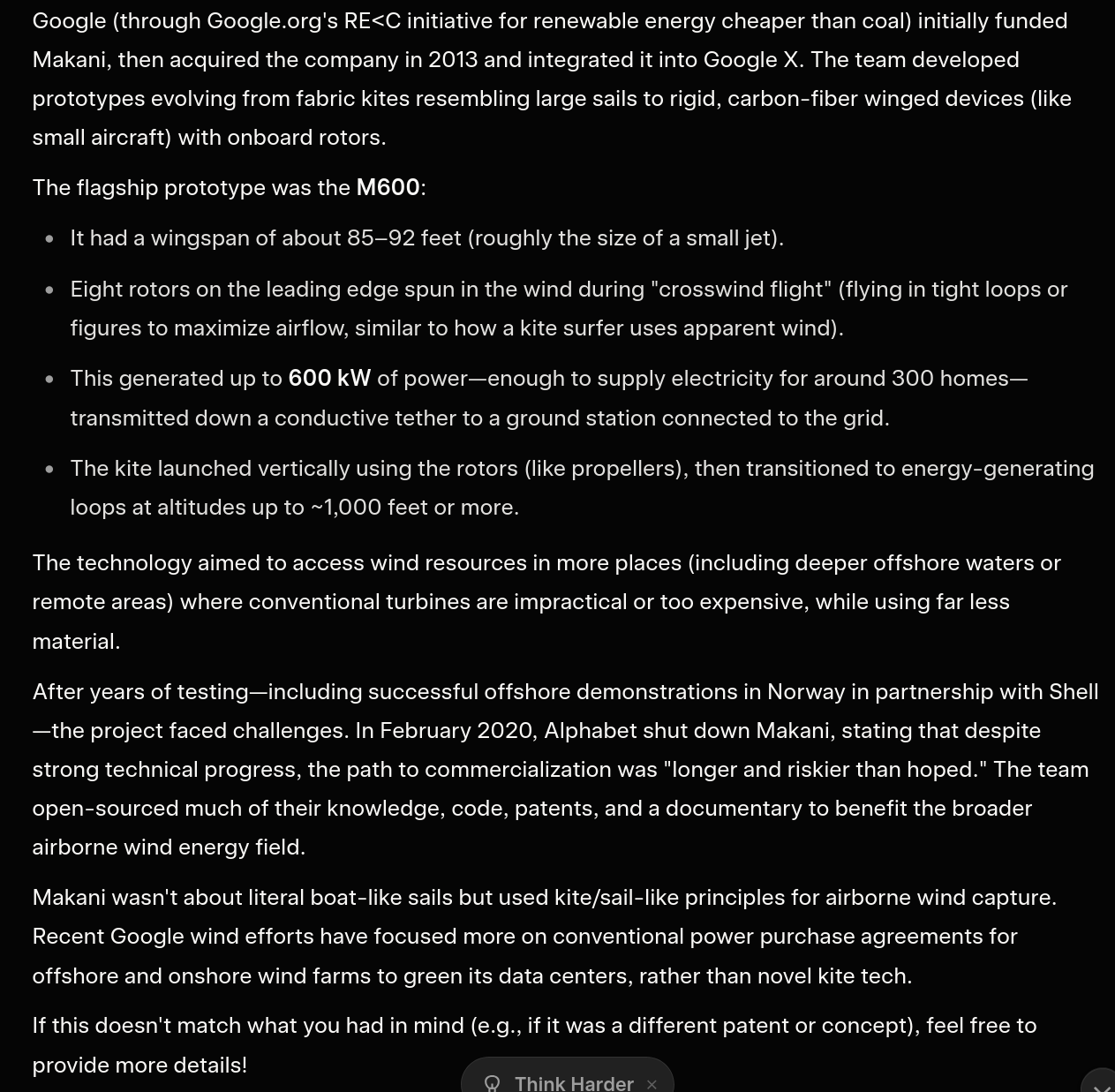 >>525969354>Why is the west unable to do sci-fi shit anymore?there was such a project, GoogleX Makani, I saw the relic in a museum somewhere in California, it was pretty retarded, maybe some engineering interns got to polish their resumes out of itmeanwhile a single land based wind turbine can do 3 Megawatts
