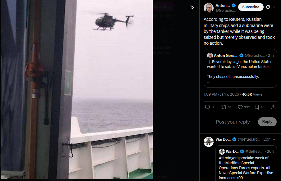 >>525970496According to Reuters, Russian military ships and a submarine were by the tanker while it was being seized but merely observed and took no action.https://x.com/Gerashchenko_en/status/2008888715935162702?s=20