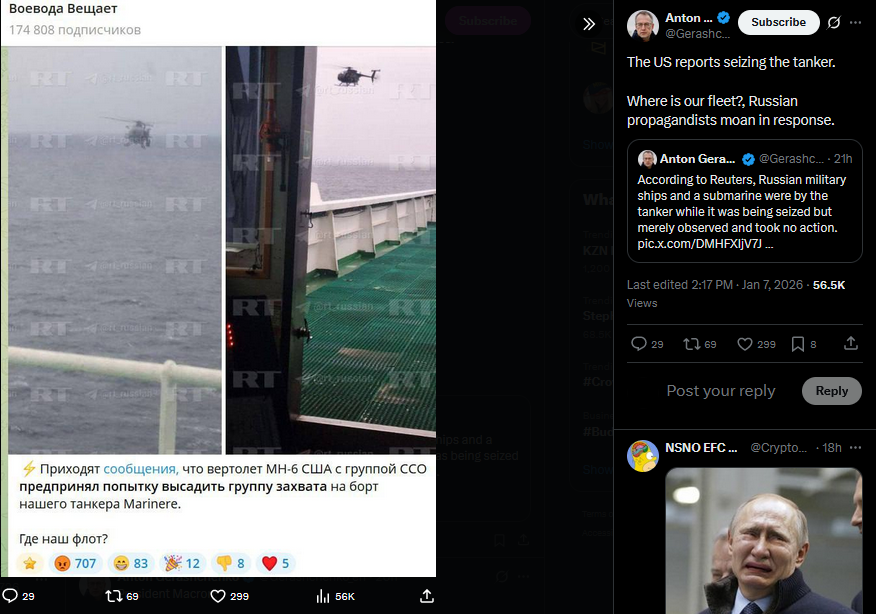 >>525970526The US reports seizing the tanker.Where is our fleet?, Russian propagandists moan in response.https://x.com/Gerashchenko_en/status/2008905868423672216?s=20>7th