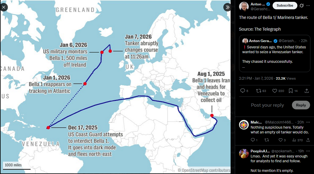 >>525970496The route of Bella 1/ Marinera tanker.Source: The Telegraphhttps://x.com/Gerashchenko_en/status/2008906845969121477?s=20>7th