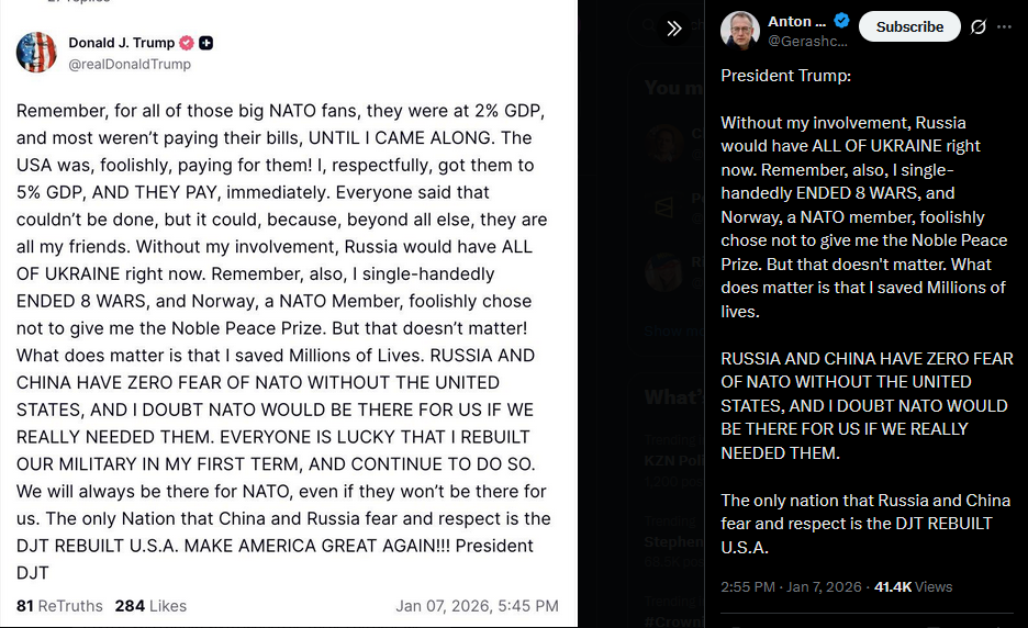 >>525970835 they will eat themselves first, case in point, those bitchesPresident Trump:Without my involvement, Russia would have ALL OF UKRAINE right now. Remember, also, I single-handedly ENDED 8 WARS, and Norway, a NATO member, foolishly chose not to give me the Noble Peace Prize. But that doesn't matter. What does matter is that I saved Millions of lives.RUSSIA AND CHINA HAVE ZERO FEAR OF NATO WITHOUT THE UNITED STATES, AND I DOUBT NATO WOULD BE THERE FOR US IF WE REALLY NEEDED THEM.The only nation that Russia and China fear and respect is the DJT REBUILT U.S.A.https://x.com/Gerashchenko_en/status/2008915412516327735?s=20>7th