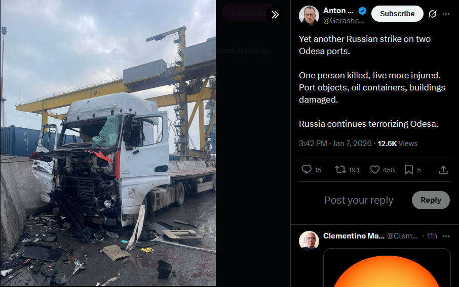 Yet another Russian strike on two Odesa ports.One person killed, five more injured. Port objects, oil containers, buildings damaged.Russia continues terrorizing Odesa.https://x.com/Gerashchenko_en/status/2008927240424198404?s=20>7th