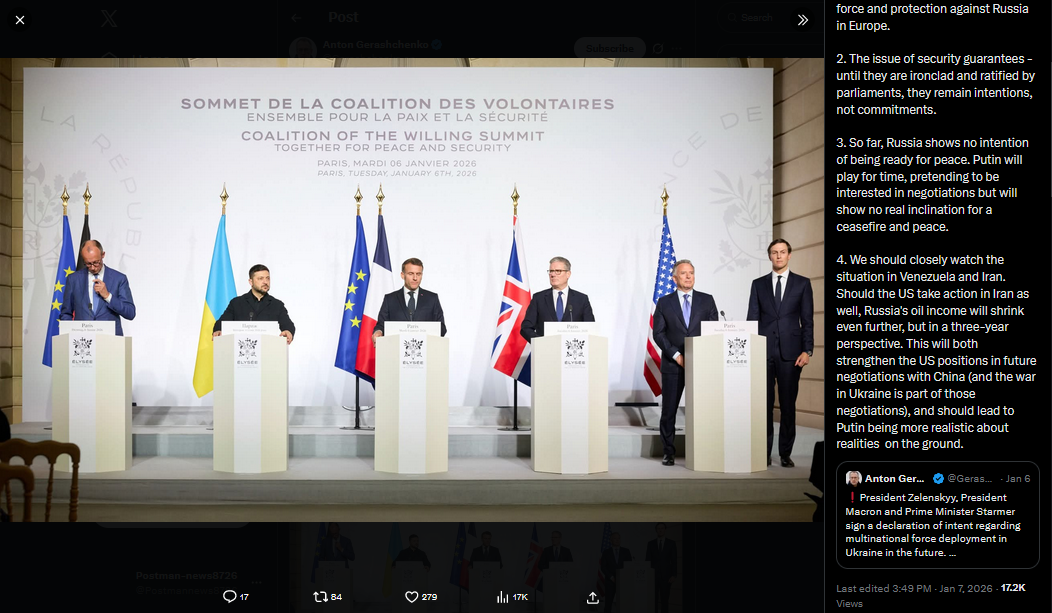 Several thoughts on the outcome of the Coalition of the Willing meeting in Paris yesterday.1. Europe sees Ukraine as a vital part of European security. Europe seems ready to finance, arm and train a 800,000 Ukrainian army that will essentially become the main security force and protection against Russia in Europe.2. The issue of security guarantees - until they are ironclad and ratified by parliaments, they remain intentions, not commitments.3. So far, Russia shows no intention of being ready for peace. Putin will play for time, pretending to be interested in negotiations but will show no real inclination for a ceasefire and peace.4. We should closely watch the situation in Venezuela and Iran. Should the US take action in Iran as well, Russia's oil income will shrink even further, but in a three-year perspective. This will both strengthen the US positions in future negotiations with China (and the war in Ukraine is part of those negotiations), and should lead to Putin being more realistic about realities on the ground.https://x.com/Gerashchenko_en/status/2008928900139581661?s=20>7th