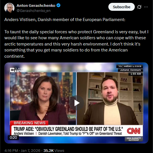 Anders Vistisen, Danish member of the European Parliament:To taunt the daily special forces who protect Greenland is very easy, but I would like to see how many American soldiers who can cope with these arctic temperatures and this very harsh environment. I don't think it's something that you get many soldiers to do from the American continent.https://x.com/Gerashchenko_en/status/2008935800994509186?s=20>7thhttps://litter.catbox.moe/64zn3y022lx327q5.mp4