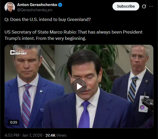 Q: Does the U.S. intend to buy Greenland?US Secretary of State Marco Rubio: That has always been President Trump’s intent. From the very beginning.https://x.com/Gerashchenko_en/status/2008945015436042698?s=20>7thhttps://litter.catbox.moe/r8psbd642s8ysm1k.mp4