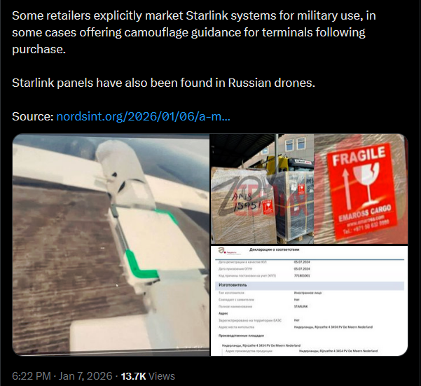 Throughout 2025, Russian companies and vendors continued to import Starlink equipment for military use, bypassing sanctions.The UAE - particularly the Sharjah-based logistics company Emaross Group FZE - serves as a major transit hub, with terminals moved using falsified customs paperwork and routed through locations such as Hong Kong and Europe.These sourcing pathways appear to feed directly into the domestic availability of Starlink systems in Russia. Starlink terminals remain in use by Russian forces in Ukraine and are widely available for both military and civilian purposes through major online marketplaces, including Wildberries and Ozon.Some retailers explicitly market Starlink systems for military use, in some cases offering camouflage guidance for terminals following purchase.Starlink panels have also been found in Russian drones.Source: https://nordsint.org/2026/01/06/a-mistake-in-the-declarations-russian-starlink-procurement-traced-via-conformity-filings/https://x.com/Gerashchenko_en/status/2008967444291866662?s=20>7thpic 1https://litter.catbox.moe/pxbg09z26qckjj4n.jpgpic 2https://litter.catbox.moe/mnt5f0syu33jdcsw.jpgpic 3https://litter.catbox.moe/l7lu2mmzkva7m8nr.jpg