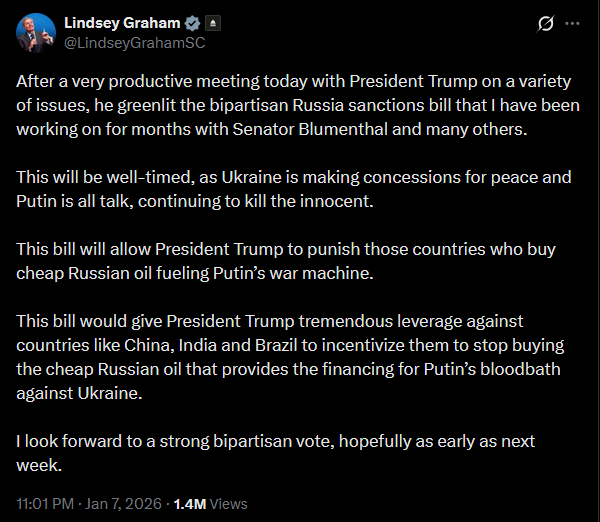 Cool news!https://x.com/Gerashchenko_en/status/2009044251280302391?s=20>7thAfter a very productive meeting today with President Trump on a variety of issues, he greenlit the bipartisan Russia sanctions bill that I have been working on for months with Senator Blumenthal and many others.This will be well-timed, as Ukraine is making concessions for peace and Putin is all talk, continuing to kill the innocent.This bill will allow President Trump to punish those countries who buy cheap Russian oil fueling Putin’s war machine.This bill would give President Trump tremendous leverage against countries like China, India and Brazil to incentivize them to stop buying the cheap Russian oil that provides the financing for Putin’s bloodbath against Ukraine.I look forward to a strong bipartisan vote, hopefully as early as next week.https://x.com/LindseyGrahamSC/status/2009037587416027479?s=20