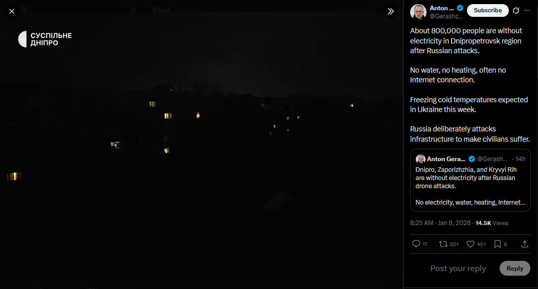Dnipro, Zaporizhzhia, and Kryvyi Rih are without electricity after Russian drone attacks.No electricity, water, heating, Internet, phone connection.The air raid alerts continue, so rescuers cannot start assessing the damage and then repairs.Russia's genocide of Ukrainians.https://x.com/Gerashchenko_en/status/2009021970986438804?s=20>7thhttps://litter.catbox.moe/2f89a9l7rxgbp25j.mp4