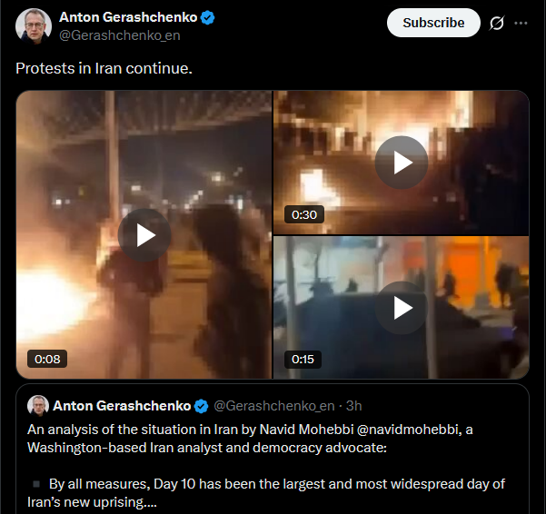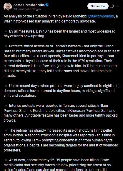 https://x.com/Gerashchenko_en/status/2009187342985171268?s=20>8thAn analysis of the situation in Iran by Navid Mohebbi @navidmohebbi, a Washington-based Iran analyst and democracy advocate:▪ By all measures, Day 10 has been the largest and most widespread day of Iran’s new uprising.▪ Protests swept across all of Tehran’s bazaars - not only the Grand Bazaar, but many others as well. Bazaar strikes also took place in at least four other cities. In a recent speech, Khamenei tried to portray bazaar merchants as loyal because of their role in the 1979 revolution. Their current defiance is therefore a major blow to him. In Tehran, merchants did not merely strike - they left the bazaars and moved into the main streets.▪ Unlike recent days, when protests were largely confined to nighttime, demonstrations have returned to daytime hours, marking a significant shift and escalation.▪ Intense protests were reported in Tehran, several cities in Ilam Province, Shahr-e Kord, multiple cities in Khorasan Province, Sari, and many others. A notable feature has been larger and more tightly packed crowds.▪ The regime has sharply increased its use of shotguns firing pellet ammunition. A second attack on a hospital was reported - this time in Tehran, following Ilam - prompting condemnation from human rights organizations. Hospitals are becoming targets for the arrest of wounded protesters.▪ As of now, approximately 25-35 people have been killed. State media claim that security forces are now prioritizing the arrest of so-called "leaders" and carrying out mass detentions to suppress the protests.▪ Families of those killed are told they can receive the bodies of their loved ones only if they state that the victim was a member of the Basij, or agree to burial without public funerals. Families who resist have, in some cases, waited for days without receiving the bodies.>part 1