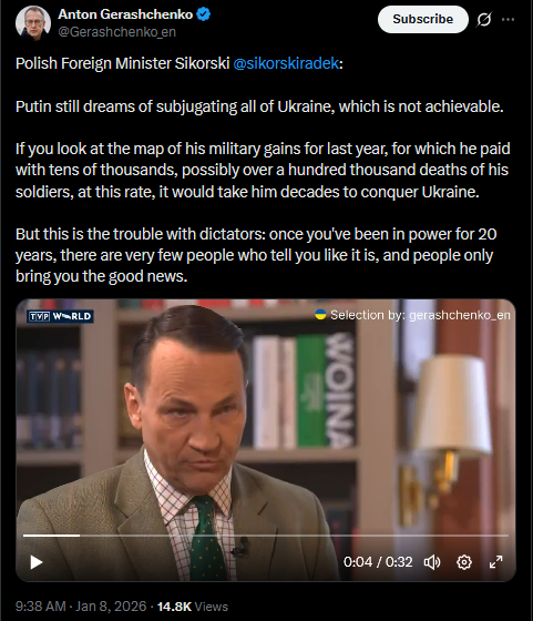 Polish Foreign Minister Sikorski @sikorskiradek:Putin still dreams of subjugating all of Ukraine, which is not achievable.If you look at the map of his military gains for last year, for which he paid with tens of thousands, possibly over a hundred thousand deaths of his soldiers, at this rate, it would take him decades to conquer Ukraine.But this is the trouble with dictators: once you've been in power for 20 years, there are very few people who tell you like it is, and people only bring you the good news.https://x.com/Gerashchenko_en/status/2009198114456969378?s=20>8thhttps://litter.catbox.moe/kvzal6c4x1bqct1l.mp4