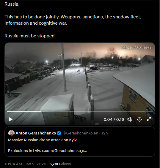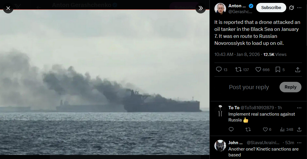 It is reported that a drone attacked an oil tanker in the Black Sea on January 7. It was en route to Russian Novorossiysk to load up on oil.https://x.com/Gerashchenko_en/status/2009214490471219270?s=20>8th