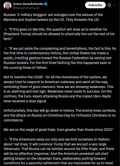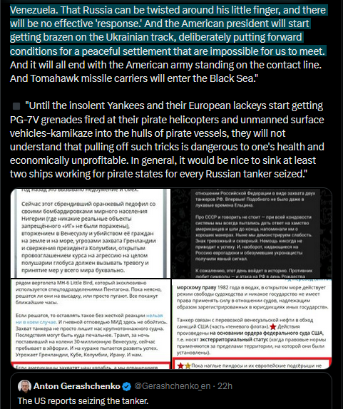 https://x.com/Gerashchenko_en/status/2009217613532893470?s=20>8thRussian 'Z-military bloggers' are outraged over the seizure of the Marinera and Sophia tankers by the US. They threaten the US.◾ "If this goes on like this, the question will arise as to whether he [President Trump] should be allowed to physically live out the rest of his term."◾ "If we put aside the complaining and lamentations, the fact is this: for the first time in contemporary history, the United States has made a public, insulting gesture toward the Russian Federation by seizing two Russian tankers. For the first time! Nothing like this happened even in the cunning times of Yeltsin.Not to mention the USSR - for all the clumsiness of the system, we always tried to respond to American rudeness and went all the way, reminding them of good manners. Now we are showing weakness. This is an alarming and bad sign. Weakness never leads to success. On the contrary, the Euro-vipers attacking Russia and the crazed Ukro-Nazis have received a clear signal.Unfortunately, this day will go down in history. The enemy loves symbols, and the attack on Russia on Christmas Day for Orthodox Christians is no coincidence.We are on the verge of great trials. Even greater than those since 2022."◾ "If the Americans seize our ship and we limit ourselves to rhetoric about 'red lines,' it will convince Trump that we are just a very large Venezuela. That Russia can be twisted around his little finger, and there will be no effective 'response.' And the American president will start getting brazen on the Ukrainian track, deliberately putting forward conditions for a peaceful settlement that are impossible for us to meet. And it will all end with the American army standing on the contact line. And Tomahawk missile carriers will enter the Black Sea.">part 1