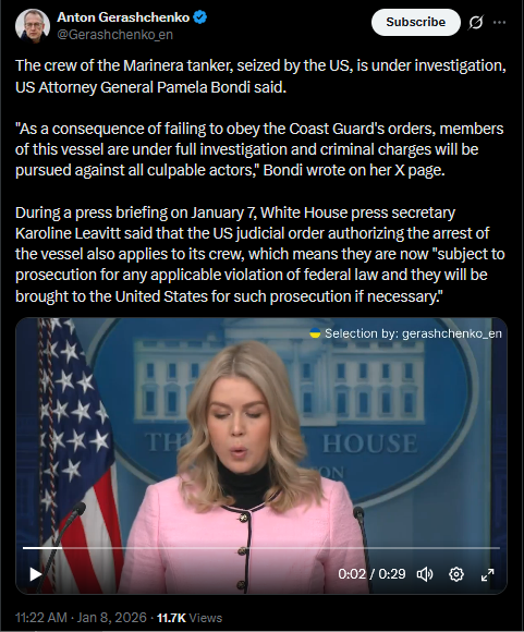 The crew of the Marinera tanker, seized by the US, is under investigation, US Attorney General Pamela Bondi said."As a consequence of failing to obey the Coast Guard's orders, members of this vessel are under full investigation and criminal charges will be pursued against all culpable actors," Bondi wrote on her X page.During a press briefing on January 7, White House press secretary Karoline Leavitt said that the US judicial order authorizing the arrest of the vessel also applies to its crew, which means they are now "subject to prosecution for any applicable violation of federal law and they will be brought to the United States for such prosecution if necessary."https://x.com/Gerashchenko_en/status/2009224126687318504?s=20>8thhttps://litter.catbox.moe/0blfjo59qf0iltjf.mp4
