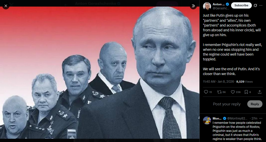 Just like Putin gives up on his "partners" and "allies", his own "partners" and accomplices (both from abroad and his inner circle), will give up on him.I remember Prigozhin's riot really well, when no one was stopping him and the regime could well have been toppled.We will see the end of Putin. And it's closer than we think.https://x.com/Gerashchenko_en/status/2009228724579750296?s=20>8th
