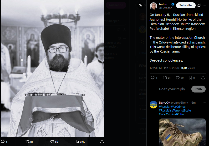 On January 5, a Russian drone killed Archpriest Heorhii Horbenko of the Ukrainian Orthodox Church (Moscow Patriarchate) in Kherson region.The rector of the Intercession Church in the Orlove village died at his parish. This was a deliberate killing of a priest by the Russian army.Deepest condolences.https://x.com/Gerashchenko_en/status/2009238735544611069?s=20>8th