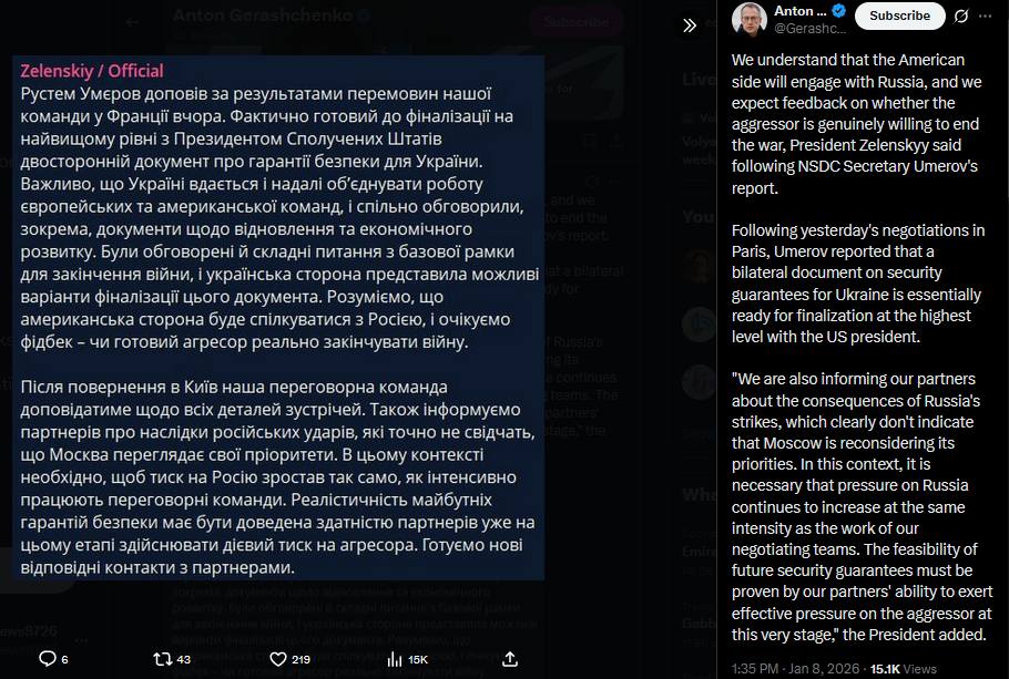 We understand that the American side will engage with Russia, and we expect feedback on whether the aggressor is genuinely willing to end the war, President Zelenskyy said following NSDC Secretary Umerov's report.Following yesterday's negotiations in Paris, Umerov reported that a bilateral document on security guarantees for Ukraine is essentially ready for finalization at the highest level with the US president."We are also informing our partners about the consequences of Russia's strikes, which clearly don't indicate that Moscow is reconsidering its priorities. In this context, it is necessary that pressure on Russia continues to increase at the same intensity as the work of our negotiating teams. The feasibility of future security guarantees must be proven by our partners' ability to exert effective pressure on the aggressor at this very stage," the President added.https://x.com/Gerashchenko_en/status/2009257752086852078?s=20>8th