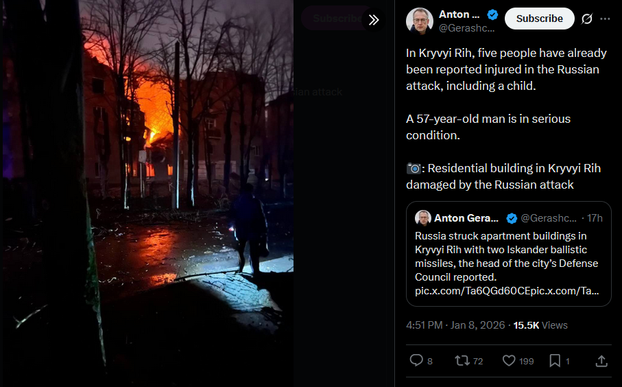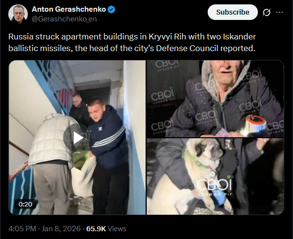 Russia struck apartment buildings in Kryvyi Rih with two Iskander ballistic missiles, the head of the city’s Defense Council reported.https://x.com/Gerashchenko_en/status/2009295299479568554?s=20>8thvideo https://litter.catbox.moe/wc9argcqb9c58t9c.mp4pic 1https://litter.catbox.moe/o8rp1vvblm37m3j5.jpgpic 2https://litter.catbox.moe/ucp4uwq7j1gvo6n7.jpg
