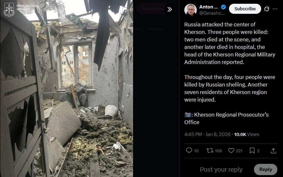 Russia attacked the center of Kherson. Three people were killed: two men died at the scene, and another later died in hospital, the head of the Kherson Regional Military Administration reported.Throughout the day, four people were killed by Russian shelling. Another seven residents of Kherson region were injured.: Kherson Regional Prosecutor’s Officehttps://x.com/Gerashchenko_en/status/2009305505924256028?s=20>8th