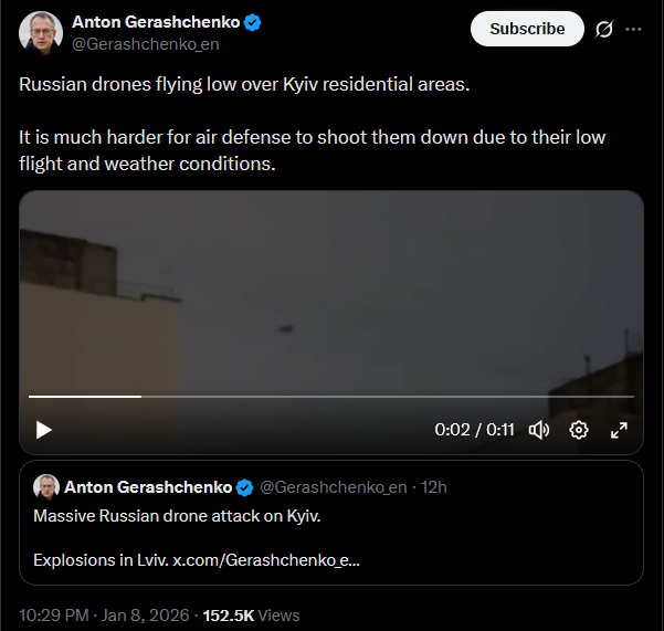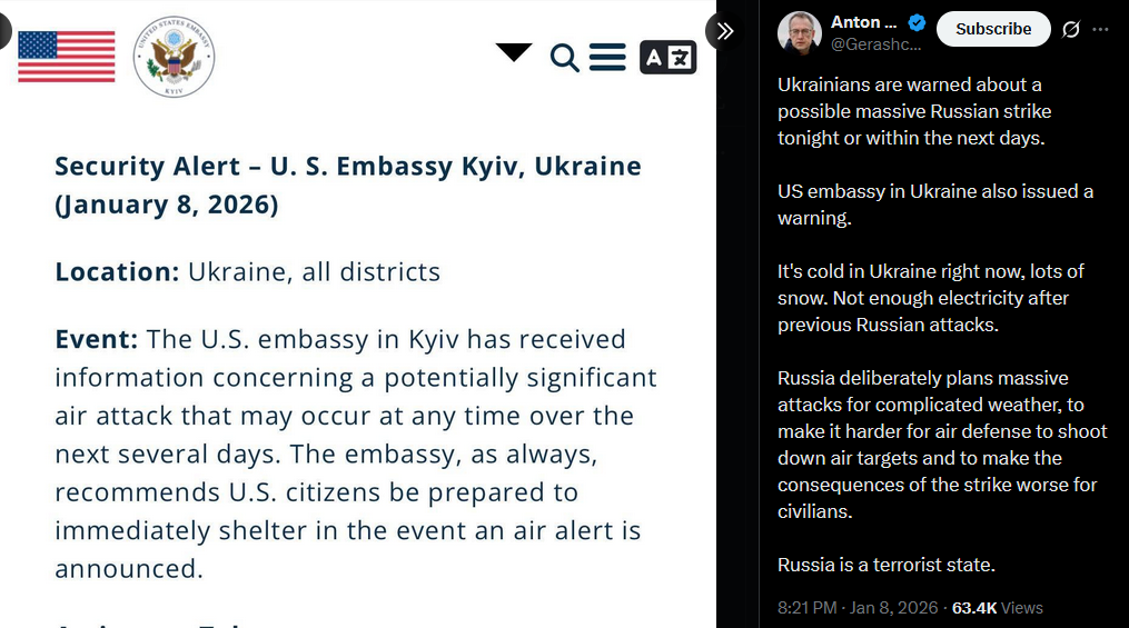 Ukrainians are warned about a possible massive Russian strike tonight or within the next days.US embassy in Ukraine also issued a warning.It's cold in Ukraine right now, lots of snow. Not enough electricity after previous Russian attacks.Russia deliberately plans massive attacks for complicated weather, to make it harder for air defense to shoot down air targets and to make the consequences of the strike worse for civilians.Russia is a terrorist state.https://x.com/Gerashchenko_en/status/2009359856885801429?s=20>8th