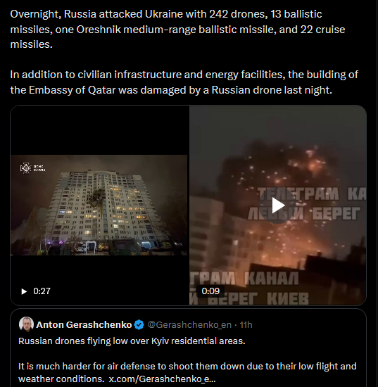>>525972984 they're also Indian and Paki>>525972748One of the most massive Russian attacks on Kyiv.Russia carried out continuous strikes overnight using ballistic and cruise missiles as well as drones, deliberately targeting civilian and critical infrastructure.40 sites were damaged in Kyiv, including 20 residential buildings.Russia also attacked Lviv, Kyiv region, Kirovohrad region, and Cherkasy region.Four people were killed, including an ambulance worker. Dozens more were injured. There was also a secondary strike on one of the residential buildings while emergency services were providing assistance after the first attack. Five rescuers, four medical workers, and one police officer were also injured.Overnight, Russia attacked Ukraine with 242 drones, 13 ballistic missiles, one Oreshnik medium-range ballistic missile, and 22 cruise missiles.In addition to civilian infrastructure and energy facilities, the building of the Embassy of Qatar was damaged by a Russian drone last night.https://x.com/Gerashchenko_en/status/2009550234678861999?s=20>9thvideo 1https://litter.catbox.moe/e0zvn0kwd30q74lq.mp4video 2https://litter.catbox.moe/y4r7j69yhbyltl3f.mp4