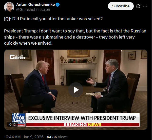 [Q]: Did Putin call you after the tanker was seized?President Trump: I don’t want to say that, but the fact is that the Russian ships - there was a submarine and a destroyer - they both left very quickly when we arrived.https://x.com/Gerashchenko_en/status/2009576946590695469?s=20>9thhttps://litter.catbox.moe/ed05y7bdjx454zlu.mp4