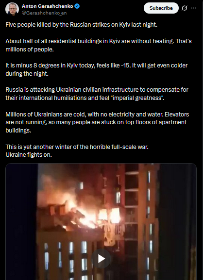 >>525973127>>525973018Five people killed by the Russian strikes on Kyiv last night.About half of all residential buildings in Kyiv are without heating. That's millions of people.It is minus 8 degrees in Kyiv today, feels like -15. It will get even colder during the night.Russia is attacking Ukrainian civilian infrastructure to compensate for their international humiliations and feel "imperial greatness".Millions of Ukrainians are cold, with no electricity and water. Elevators are not running, so many people are stuck on top floors of apartment buildings.This is yet another winter of the horrible full-scale war.Ukraine fights on.https://x.com/Gerashchenko_en/status/2009598046586163450?s=20>9thhttps://litter.catbox.moe/3ghifrxiqkv19eum.mp4