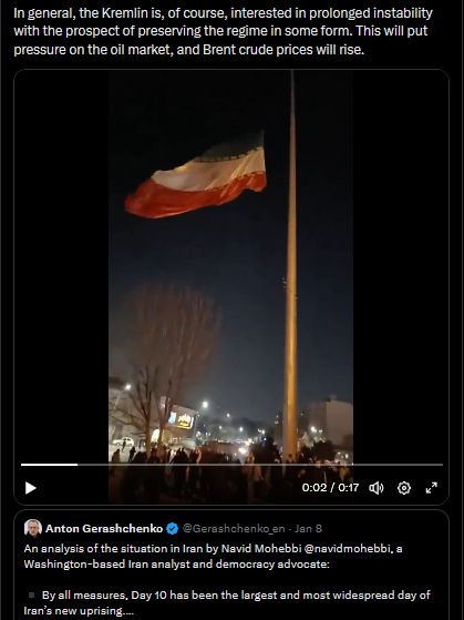 >>525971723>>525971755The revolutionary situation in Iran continues to escalate. Mass anti-government street protests continue. The number of participants has increased again, including in Tehran. Clashes with law enforcers have once again taken place. There are reports of administrative buildings being set on fire.Against the backdrop of the protests, the authorities have completely shut down Internet access across the country, so information coming out of Iran about the protests is fragmentary.Is Moscow really ready to lend a helping hand to the Iranian regime? I think that even if it wanted to, it couldn't because it is tied up with the war in Ukraine.To all appearances, the assistance is limited to several transport aircraft with means for dispersing demonstrators and rumors of Khamenei's possible escape to Moscow. There are also reports of a certain movement of Iranian funds and valuables towards Russia.In general, the Kremlin is, of course, interested in prolonged instability with the prospect of preserving the regime in some form. This will put pressure on the oil market, and Brent crude prices will rise.https://x.com/Gerashchenko_en/status/2009610117713465733?s=20>9thhttps://litter.catbox.moe/7yhoxbddw0aq4u4h.mp4