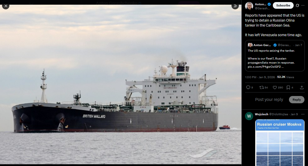 Reports have appeared that the US is trying to detain a Russian Olina tanker in the Caribbean Sea.It has left Venezuela some time ago.https://x.com/Gerashchenko_en/status/2009611347609481541?s=20>9th
