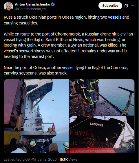 Russia struck Ukrainian ports in Odesa region, hitting two vessels and causing casualties.While en route to the port of Chornomorsk, a Russian drone hit a civilian vessel flying the flag of Saint Kitts and Nevis, which was heading for loading with grain. A crew member, a Syrian national, was killed. The vessel’s seaworthiness was not affected; it remains underway and is heading to the nearest port.Near the port of Odesa, another vessel flying the flag of the Comoros, carrying basedbeans, was also struck.https://x.com/Gerashchenko_en/status/2009688939523608885?s=20>9th