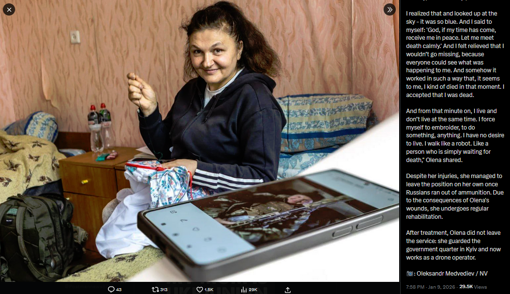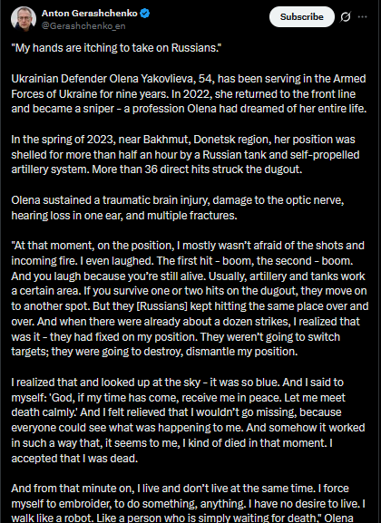 https://x.com/Gerashchenko_en/status/2009716497086832891?s=20>9th"My hands are itching to take on Russians."Ukrainian Defender Olena Yakovlieva, 54, has been serving in the Armed Forces of Ukraine for nine years. In 2022, she returned to the front line and became a sniper - a profession Olena had dreamed of her entire life.In the spring of 2023, near Bakhmut, Donetsk region, her position was shelled for more than half an hour by a Russian tank and self-propelled artillery system. More than 36 direct hits struck the dugout.Olena sustained a traumatic brain injury, damage to the optic nerve, hearing loss in one ear, and multiple fractures."At that moment, on the position, I mostly wasn’t afraid of the shots and incoming fire. I even laughed. The first hit - boom, the second - boom. And you laugh because you’re still alive. Usually, artillery and tanks work a certain area. If you survive one or two hits on the dugout, they move on to another spot. But they [Russians] kept hitting the same place over and over. And when there were already about a dozen strikes, I realized that was it - they had fixed on my position. They weren’t going to switch targets; they were going to destroy, dismantle my position.I realized that and looked up at the sky - it was so blue. And I said to myself: 'God, if my time has come, receive me in peace. Let me meet death calmly.' And I felt relieved that I wouldn’t go missing, because everyone could see what was happening to me. And somehow it worked in such a way that, it seems to me, I kind of died in that moment. I accepted that I was dead.>part 1
