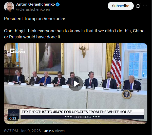 President Trump on Venezuela:One thing I think everyone has to know is that if we didn't do this, China or Russia would have done it.https://x.com/Gerashchenko_en/status/2009726315637649884?s=20>9thhttps://litter.catbox.moe/v292ed17m2navynq.mp4