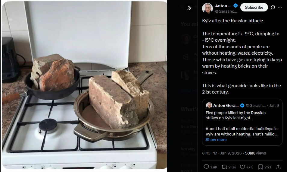 Kyiv after the Russian attack:The temperature is -9°C, dropping to -15°C overnight.Tens of thousands of people are without heating, water, electricity.Those who have gas are trying to keep warm by heating bricks on their stoves.This is what genocide looks like in the 21st century.https://x.com/Gerashchenko_en/status/2009727807354523686?s=20