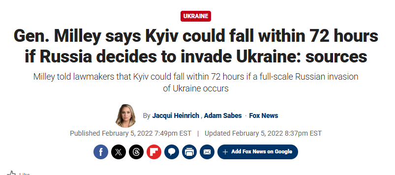 >>525980400>Ignore the actual source where it came fromkek, all you have to do is follow the chronology, pidrila. YOUR russian ruling elites kept opining on the ability of russia to conquer Ukraine in mere days/weeks. Milley's opinion (according to "sources") came WAAAAY later then the russian bravado, which came from pootin himself.