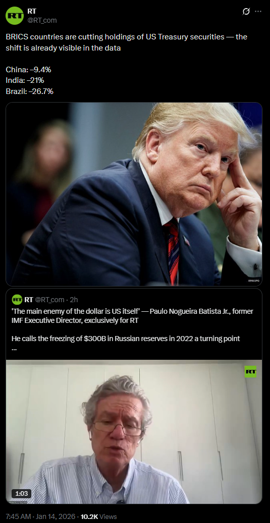 Brazil is leading the BRICS nations in dropping US treasury securities, i guess we didn't like Trump trying to use tariffs to place his puppet in power.meanwhile, Argentina became a dumping fround fo US debt and a safe haven for israeli war criminals that are burning down Patagonia in order to buy the wasted land for cheap.