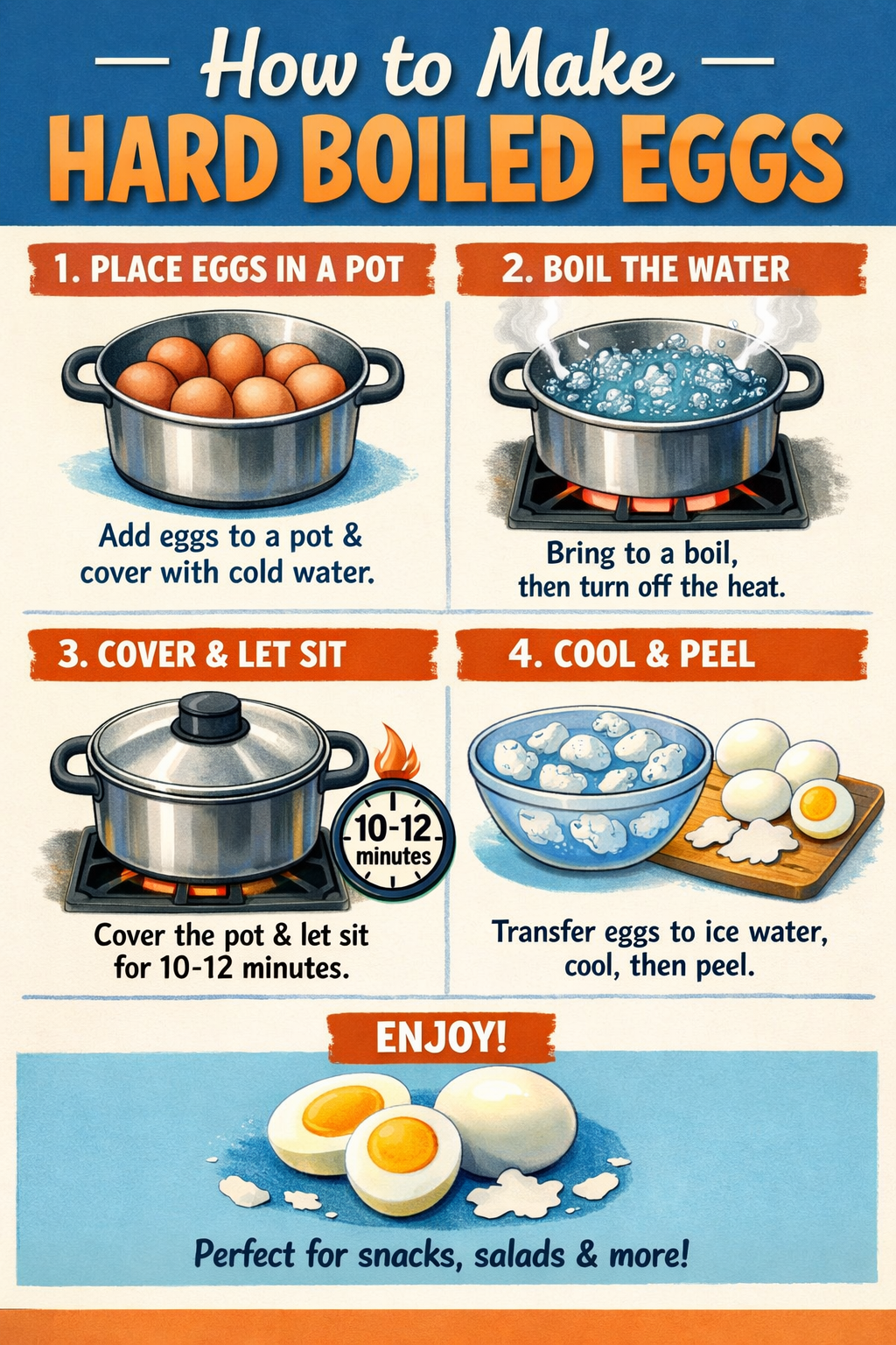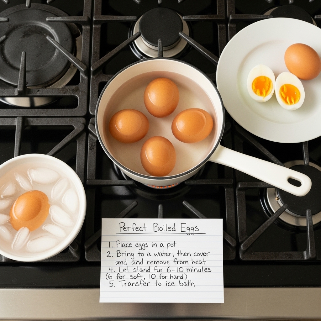 Here's my no-fail recipe: 1. Boil water with salt2. Wait for a rolling boil3. Add your eggs gently with a spoon4. Set timer to 8 minutes5. Take out eggs and drop in a large bowl of cold water6. Wait a few minutes and peel eggs inside the cold water7. Enjoy your perfect eggs