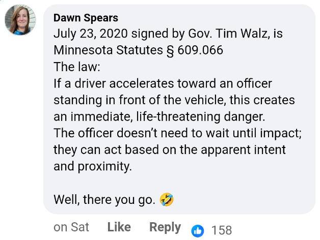 >>525988262Him being struck shows she tried to drive into him. A reasonable person has a reasonable fear for their life when someone tries to run them over. A reasonable person with a reasonable fear for their life may use lethal force to prevent the threat to their lives and other lives. This is federal law. This is minnesota law. This was a cut and dried good shoot. It is a tragedy. The tragedy is a woman decided to try to kill johnathan.