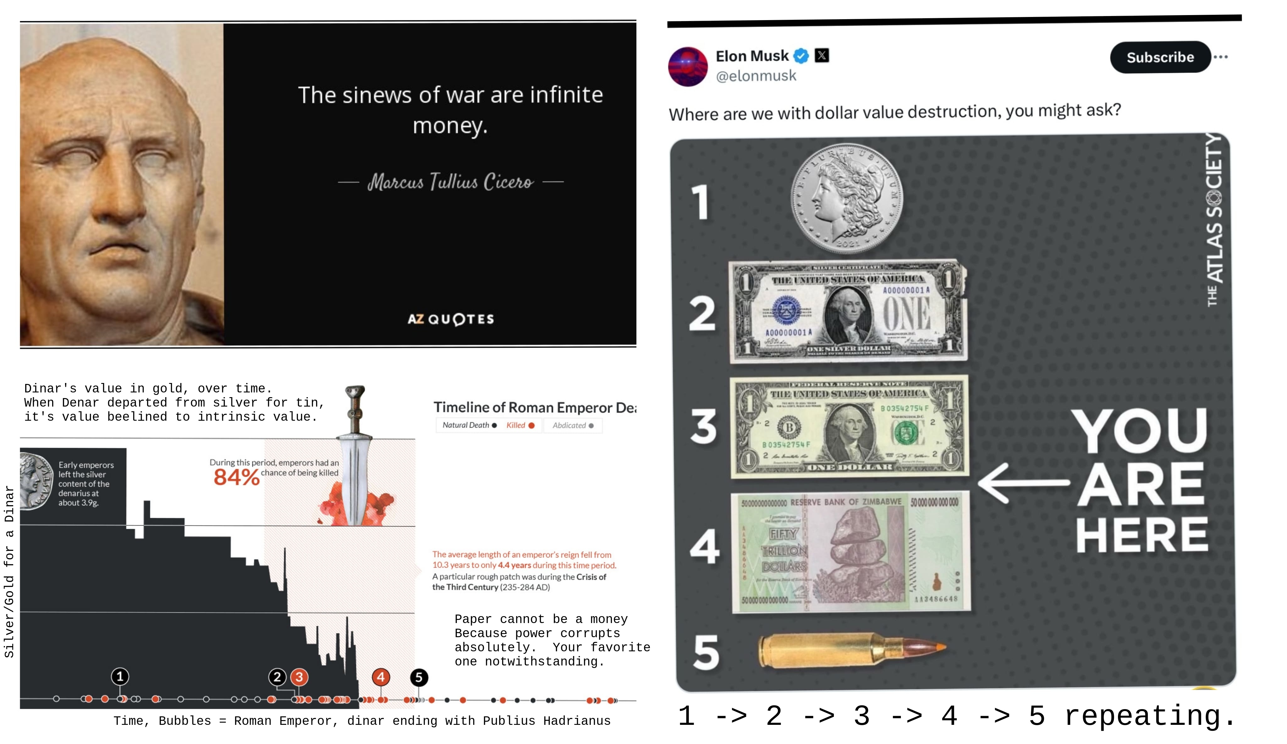 He's telling everybody that if you own US Dollars now, you're about to own a claim on thin air as we show you that moneyprinting doesn't have to be tethered to the Bond, Treasury, or TripleTranche Markets. Said another way, printing money doesn't need to be associated with creating debt which comes with maturity dates, interest rates and all that. The USA can simply print money full stop no more noises. He's telling you and everyone to take your trillions of US Dollars in trickledown and set that shit into concrete asap, because soon, USD is going to lose 99% of its buying power every year, then month, then week, then day, and finally, the government will simply Replace USD with something else. And having Dollars in your bank account will be like owning that much monopoly money.He's saying the US Government is about to show you its final form, what we were when we came over in 1600's Armed Robbers with guns blazing put the goods and services in the bag or you gonna get a bullet in the chest.