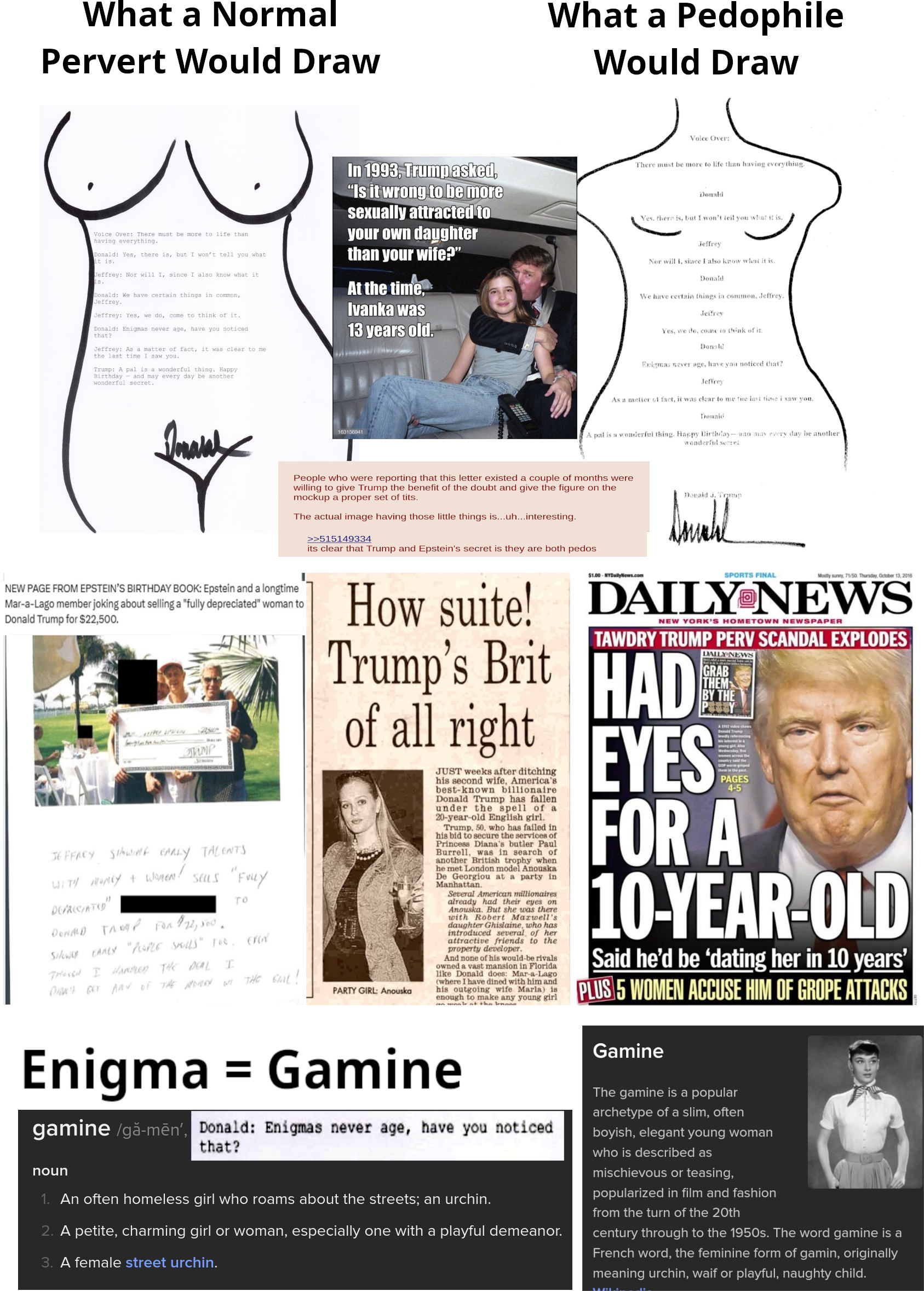 >>525991690>>MY FEELINGS ARE PROOF!!Nice bait, but the proof is in Trump's own words. He bragged about going backstage at Miss Teen USA to ogle the underage contestents as they got dressed, and admits he only broke things off with Epstein after he poached massuers from Maralago.